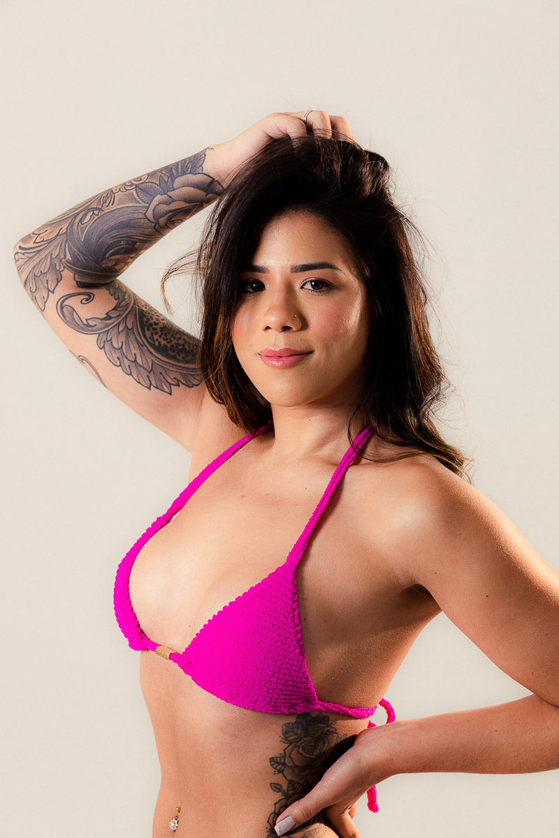 O Top Bondi Beach Pink é um modelo de top triângulo cortininha ajustável, com alças para amarração nas costas e no pescoço, não possui bojo. Ele é feito em um tecido de alta qualidade de Poliamida microfilamentada com efeito enrugado irregular (82%) com Elastano (18%), trazendo um toque macio e com muita elasticidade.