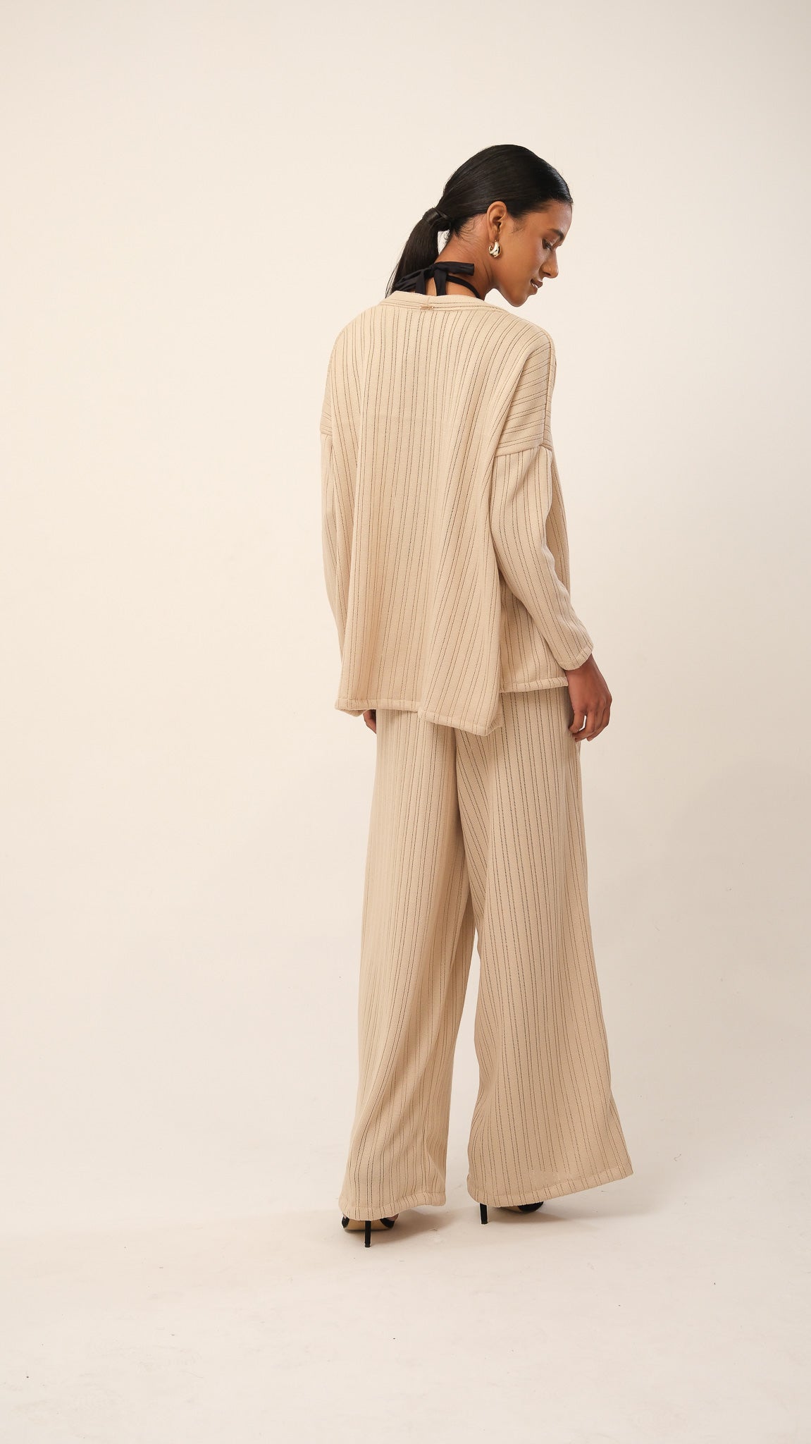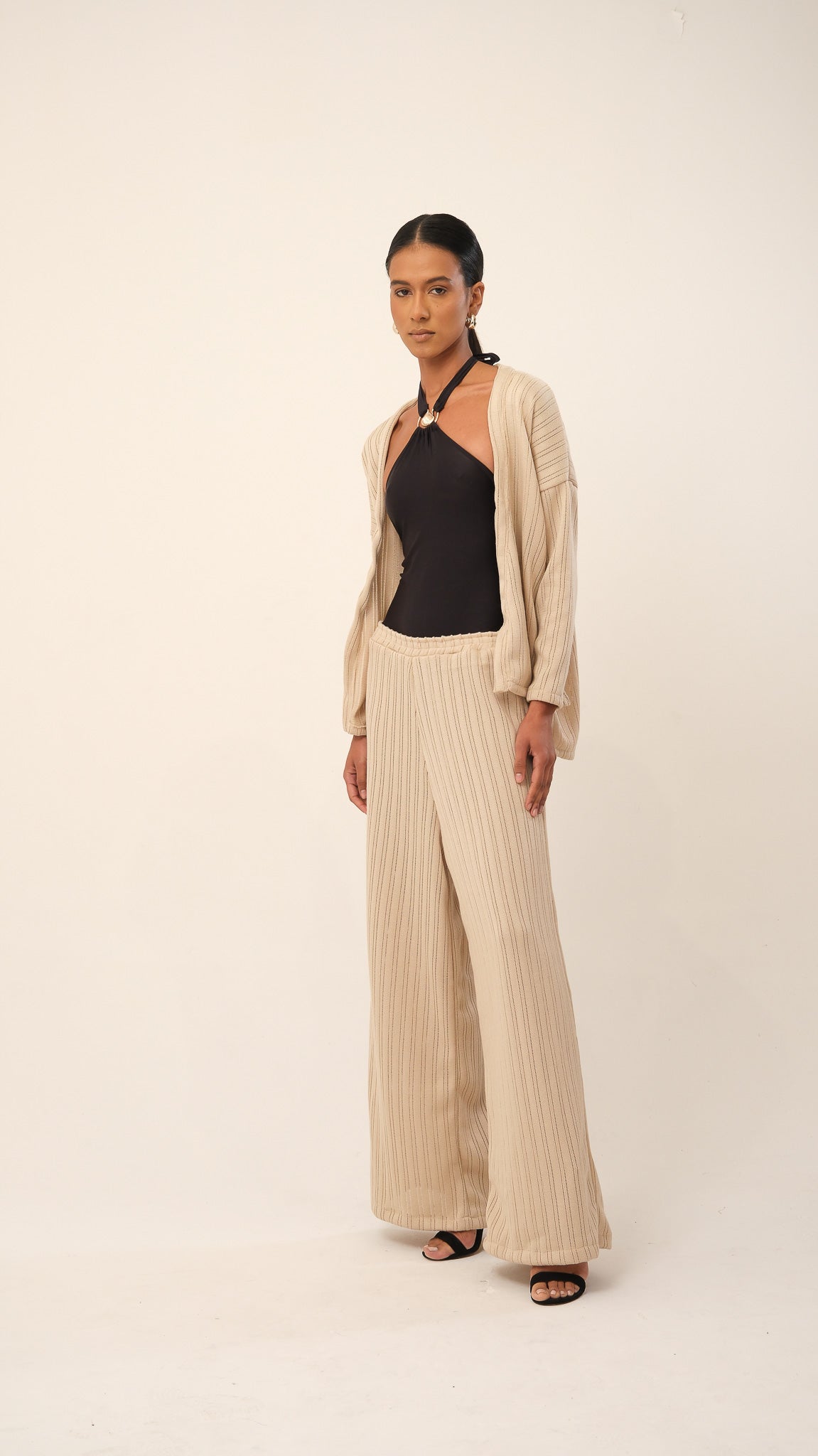 A calça pantalona em tricot possui cós com elástico para ajuste confortável e modelagem ampla, garantindo liberdade de movimento. Com textura encorpada e visual sofisticado, é perfeita para compor looks de inverno com leveza e estilo.